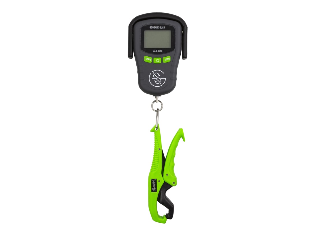 GOOGAN 55LBS SCALE: Bring your prize to the finish line with this digital scale. The lip-gripper keeps your fish secured to the scale. Then, record the weight quickly with the easy to read display. This scale holds a capacity of 55lbs and comes equipped with two AAA batteries.